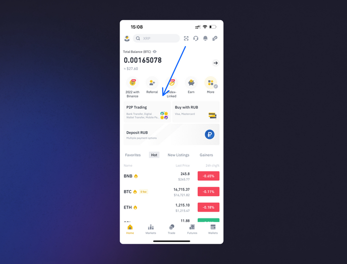 1. Переходим в раздел «P2P-торговля» (P2P Trading), обозначен на скрине.