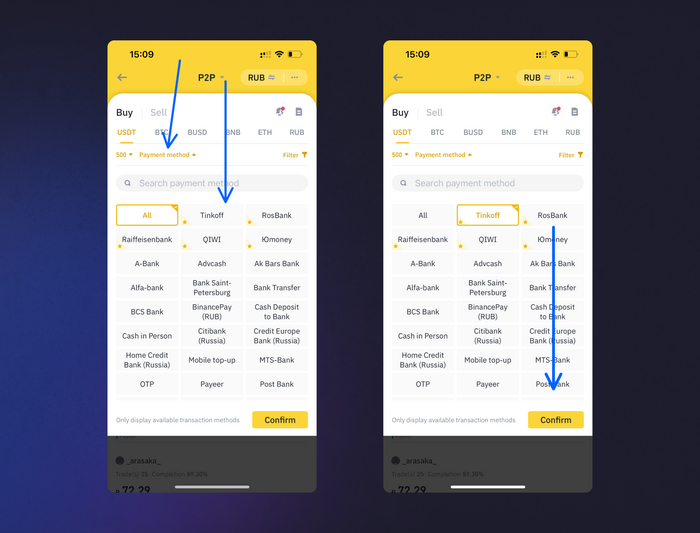 3. Далее необходимо настроить фильтр способов оплаты. Нажмите кнопку «Способы оплаты» (Payment method) и выберите ваш банк. Я буду использовать карту Тинькофф банка.