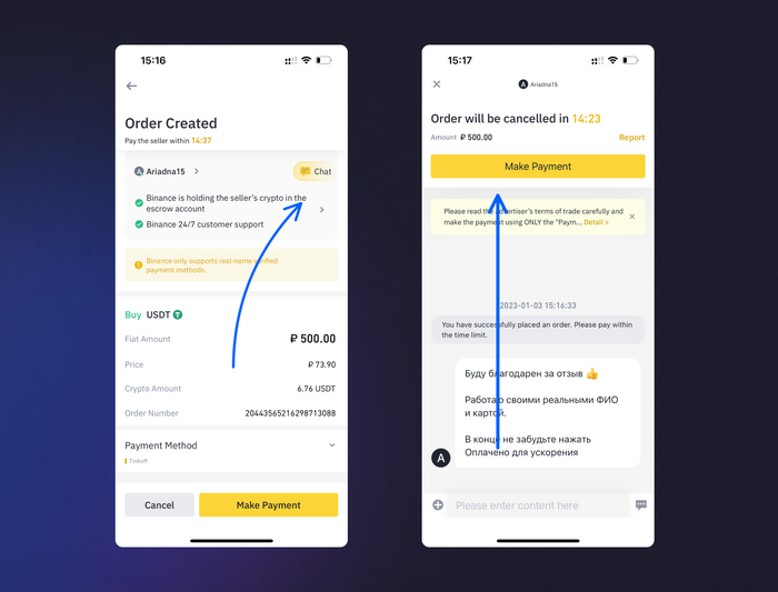 8. Если в чате пусто — нужно нажать кнопку «Выполнить оплату» (Make Payment). В открывшемся окне нужно будет скопировать номер карты получателя. Обозначен на скрине ниже, справа.