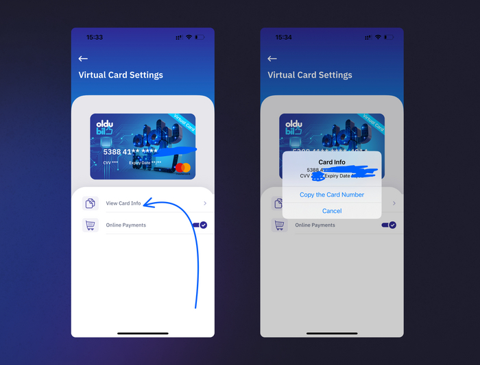2. Вводим данные виртуальный карты из OlduBil, проводим оплату.