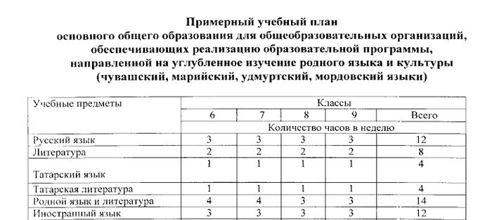 Как мы видим, количество часов немного расходится... Преподается 5 часов русского языка и русской литературы и 4 часа родного языка и родной литературы. Наверное внимательные заметили, что русских дисциплин стало меньше, а родного языка стало больше, но всего на 1 час... И если раньше было соотношение 9/3 то теперь 5/4... Но все равно не сходится, где-то потерялось еще 3 часа... ведь МинОбрНауки РФ рекомендовало суммарно двенадцать часов, а МинОбрНауки РТ дает только 9 часов! Где еще часы? А все очень просто! В РТ сделали ход конем и помимо изучения родного языка ввели 2 часа изучения татарского языка и литературы (думаю не сложно догадаться в ущерб чему).