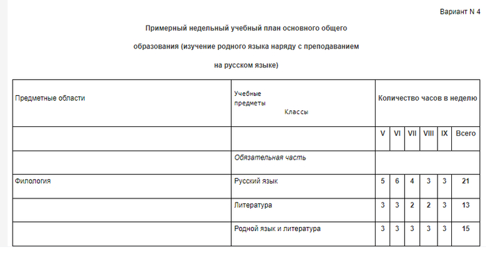 Ниже скриншот того, какие рекомендации дает Министерство образования и науки Российской Федерации. На примере 6 класса видим, что регионам рекомендуют в неделю проводить 9 уроков русского языка и русской литературы и 3 урока РОДНОГО языка и литературы. Это логично, правильно и не вызывает диссонанса.