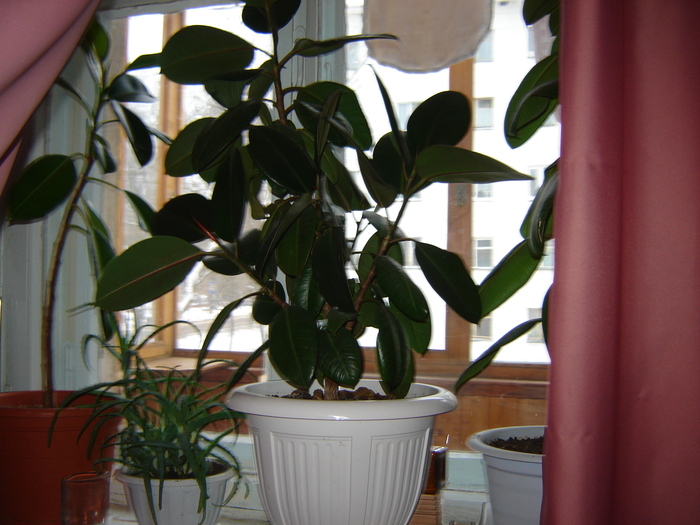 Почти сразу мы сменили ему горшок и тут он КАК ЛОМАНУЛСЯ в рост! Как начал ветвиться! И перестал помещаться сначала на подоконнике, потом в узком балконном проеме в гостиной и мы переставили его к дочери - там проем пошире. Потом у нас завелась кошонка с крохотными лапками, которая любила порыться в фикусячьем горшке (к тому времени мы нашли ему горшок побольше).
