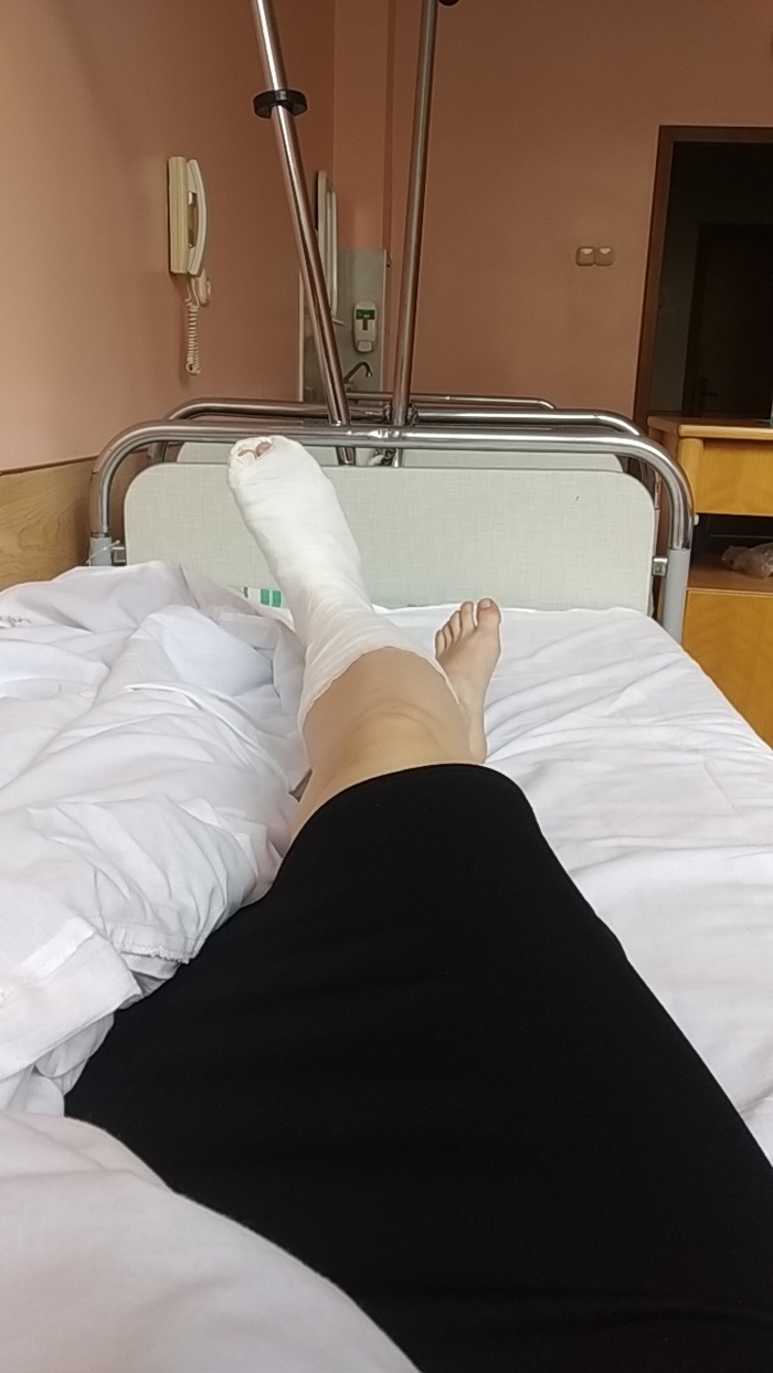 Обезболивающие действовали около часа, потом боль возвращалась. Но я все ровно умудрялась не плохо спать в эти мало-болезненные часы. На следующий день боль была уже чуть меньше, но все ровно достаточно сильной. Я уже могла передвигаться, но дальше туалета сил и желания идти не было. Поэтому я сделала выбор "еда,сон,туалет". Так и провела день. Ах да, ещё возили на снимок. К вечеру нога стала отекать, прогулки до туалета дали свои плоды, и гипс снова стал давить. Вечерняя медсестра подрезала мне бинт, легонько замотала сверху и велела держать ножку повыше. Ночь пережила.