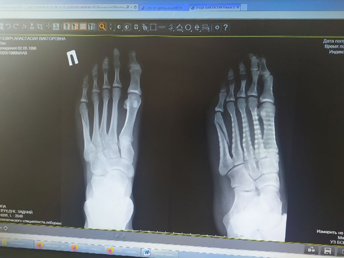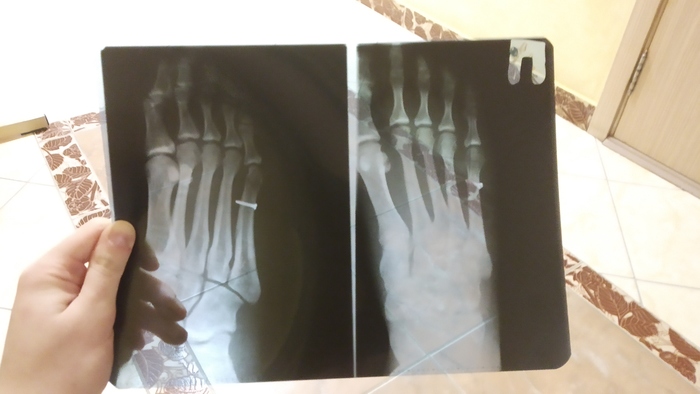 В рентгенологии мне бережно сделали два снимка и попросили подождать на корридоре. Сидим, ждём, шутим. Спустя минут 5 выходит врач и протягивает мне листок с расшифровкой снимка. Тут то мое лицо, которое я так держала и сдалось. На глазах навернулись слезы. Диагноз: косой спиральный перелом 5 плюсневой кости в дист- мета- диафизе с небольшим смещением (фото снимка прилагаю). Прощай походы, прощай велик, прощай скалодром.