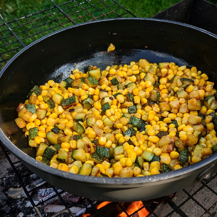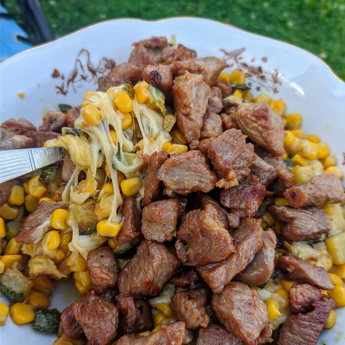 Заливаем сверху яйца с молоком и сыром и помогаем им равномерно распределиться по форме. Туда же кидаем кубики моцареллы. Можно, кстати, фетаксу использовать, если любите. Правил здесь особо нет.
