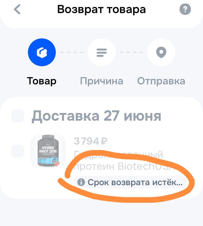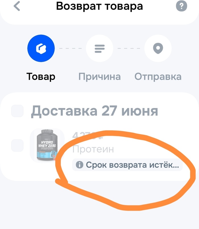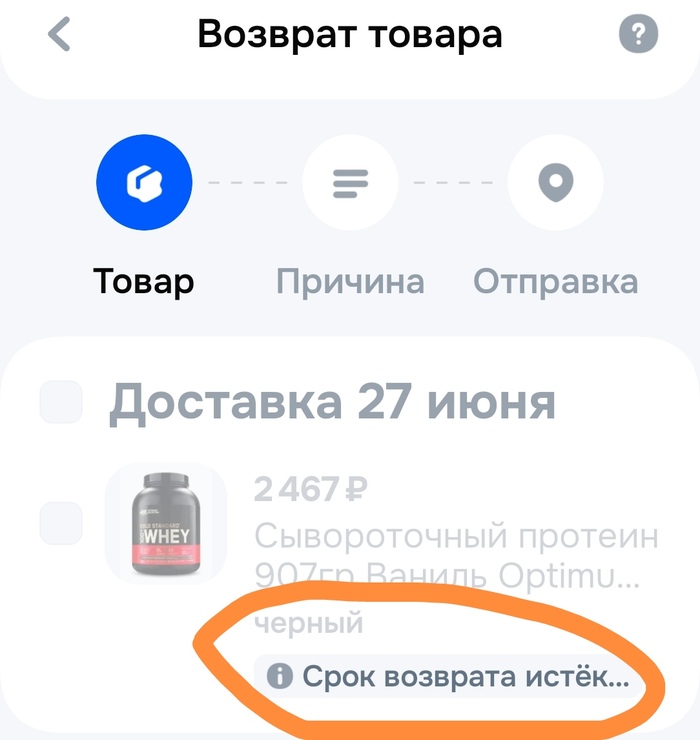 Через корзину нет возможности составить претензию, оформить возврат, пишет истек срок. Я вчера только получила. В пункте выдачи вкусовые качества не возможно проверить