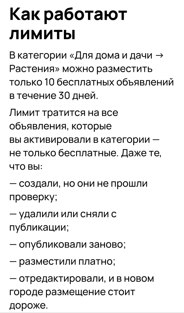 Подскажите, кто разбирается, как обойти эту систему. Лимит бесплатных объявлений в категории "растения" 10 штук. Размещаю следующие платно. Каждые 30 дней объявление публикуется заново.