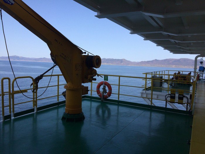 Далее было, пожалуй, самое захватывающее приключение в жизни! Кран, который видно на заднем фоне на ППБУ опускает на корабль транспортируемую кабинку, в которой вас пристегивают ремнями безопасности и отправляют в свободный полет над Охотским морем. Ни я, ни коллега не отважились снимать это зрелище, но, поверьте, это было очень круто! Когда ты раскачиваешься в воздухе в кабинке, по типу напоминающую открытую кабину на колесе обозрения, на высоте приблизительно в 50 метров... Такие вещи не забываются!!!