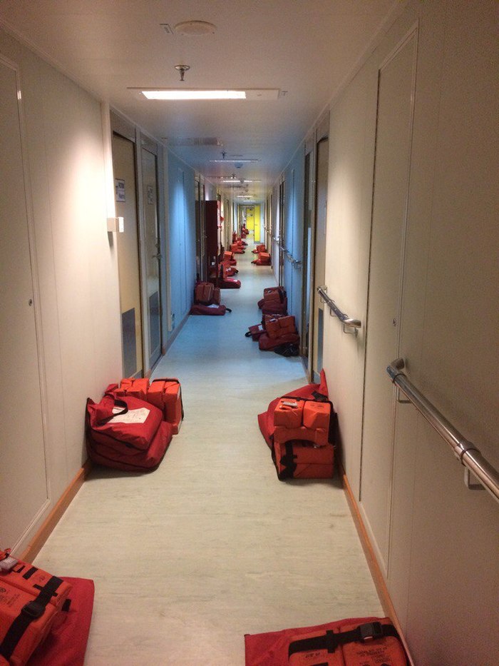 На первой платформе мы пробыли чуть более суток, и потом нас перебросили на вторую. Очередное путешествие в кабинке на корабль, потом с корабля на ППБУ вынесено за скобки, т.к. это самое крутое мероприятие в командировке )). Там нам сразу сообщили о готовящихся учениях. К слову сказать, что касается ОТиПБ (охраны труда и промышленной безопасности) на установках все строго! Не думаю, что ситуация, произошедшая в фильме "Глубоководный горизонт" (кто не смотрел-настоятельно рекомендую) у нас возможна. Каждый сотрудник на платформе должен знать свой номер, номер спасательной шлюпки откуда он может эвакуироваться и т.п. Ниже фото в момент проверки спасательных средств