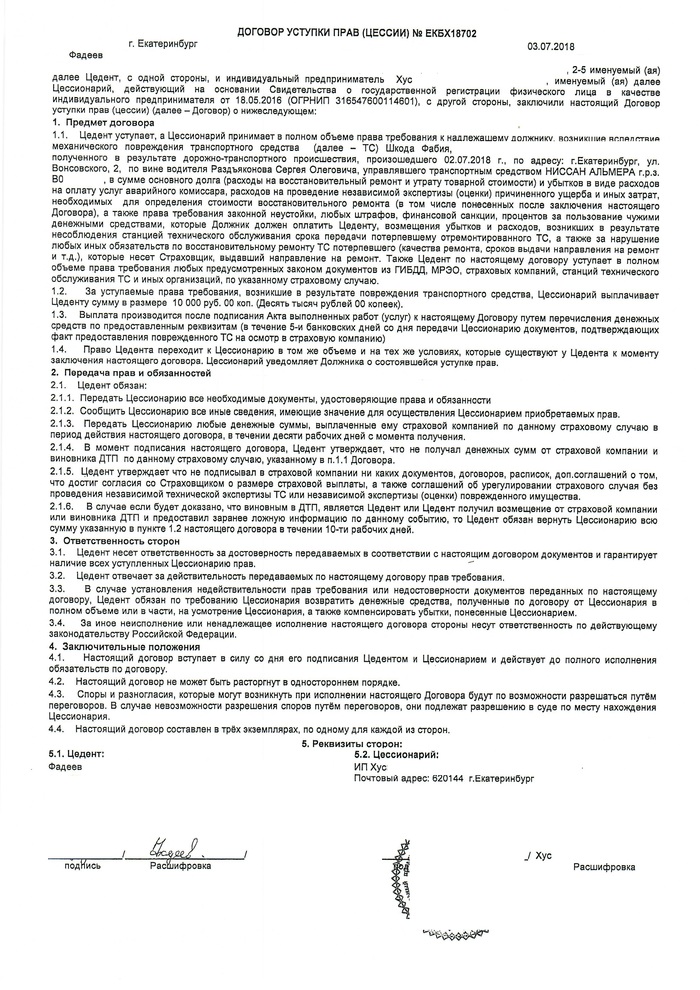 Юрист который оказывал мне услуги в прошлый раз с документами ознакомился и сказал что готов выступить за скромные 10к рублей. Не знаю на сколько это законно. Я считаю что не смотря на прошедший срок, должен был получить он него помощь в рамках того же договора, ведь идет речь о том же самом ДТП. Договор есть, я думаю акт выполненных работ я успешно подписал, но как-то не по людски это мне кажется. Денег у меня лишних нет. Как быть - не знаю. Если восстановят сроки, я так понимаю суд должен будет состояться заново, и может иметь совершенно другое окончание. В худшем случае я так понимаю я должен буду вернуть деньги своей страховой кампании и кроме того заплатить за услуги представителя цессионария