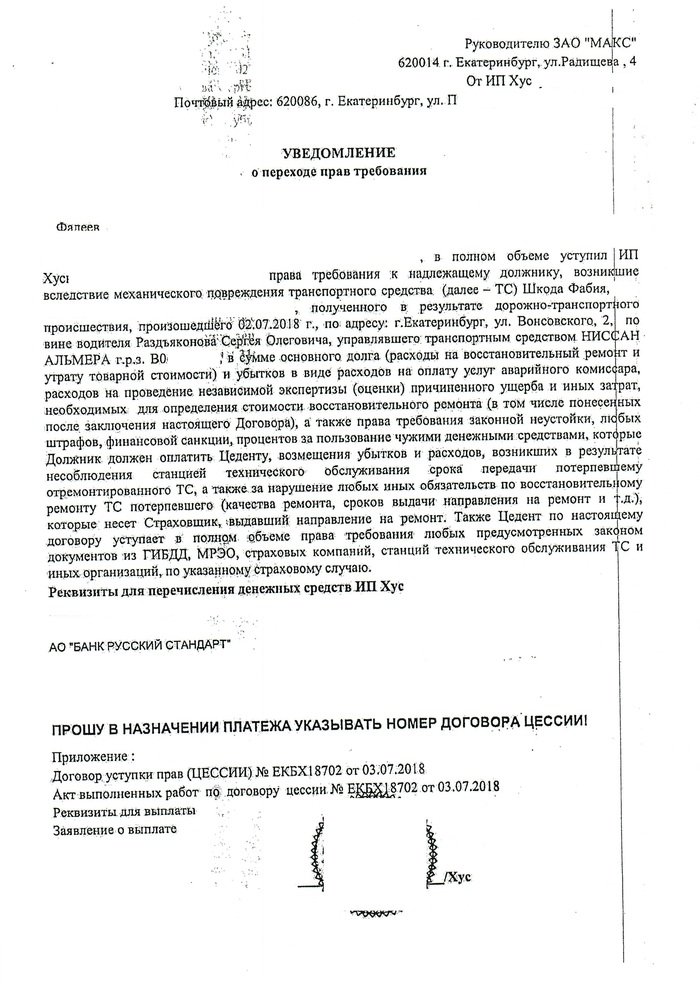 далее уведомление о переходе прав требования, договор уступки прав(цессии), претензия страховой о возврате излишне уплаченых деню средств: