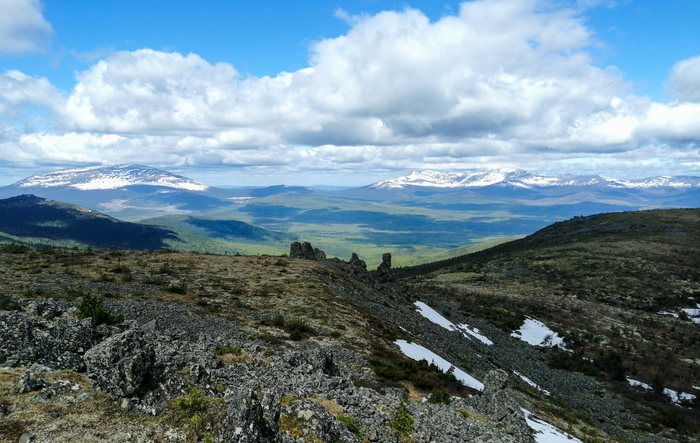 Второй день похода нас встретил солнечной погодой. Умывшись в горной речке и позавтракав, мы начали подъем на гору Семичеловечью. На тропе нас встретил сильный бурелом, и вездесущий/срущий лосяш. На вершине горы нам открылась панорама на Косьвинский, Конжаковский, Серебрянский камень. На самой Семичеловечьей очень много каменных останцев, своими формами напоминающих каменных людей, от чего гора и получила такое название.