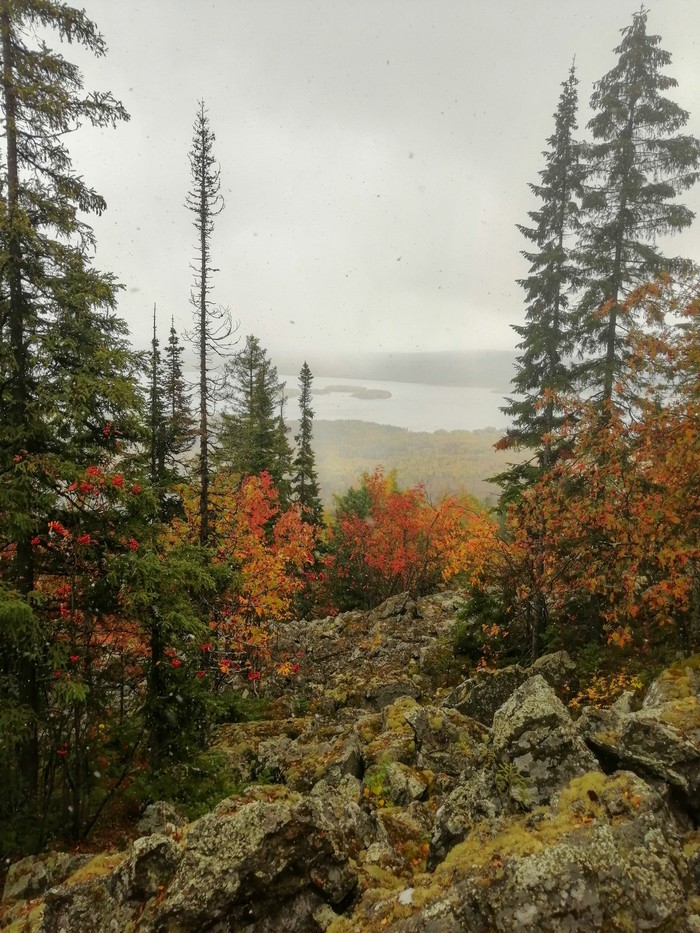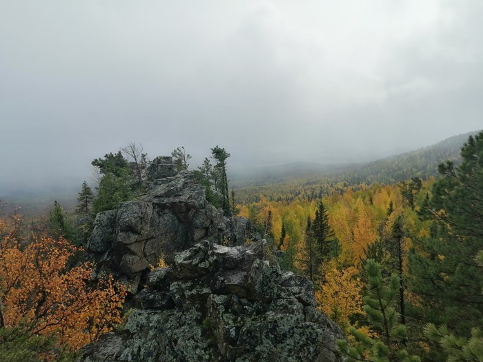 пожухлой травы и ароматом ёлок. Мелкий курумник на подъёме, заросший мхом, покорно расстелился до самой вершины. На вершине с открывающимися разноцветными просторами осени начинал идти снег...