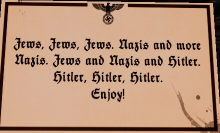 Шалев Моран, Алан Карми, Надав Хексельман и Беннедикт Хуммель разработали пародию на Wolfenstein, о чем сразу предупреждают игрока. Как и о том, что здесь есть: свастика, портреты фюрера, нацисты и усы. По сути, в игру запихнули все, что Bethesda старательно вырезала из немецкой версии. Вот только все остальное убрали. По итогу мы имеем восхитительную арену, MG-42 (кажется) с мушкой в виде звезды Давида, гигантские свастики повсюду и плакат с Гитлером, с которого спрыгивают усы, начиная поливать нас… чем-то. Эти усы — и есть наш противник. Ну, они и их гигантская форма, которая пытается нас раздавить. Все действо происходит под «Полет Валькирий». Когда все «нацисты» умирают, игра показывает, сколько времени на это потрачено (пара минут — не больше).