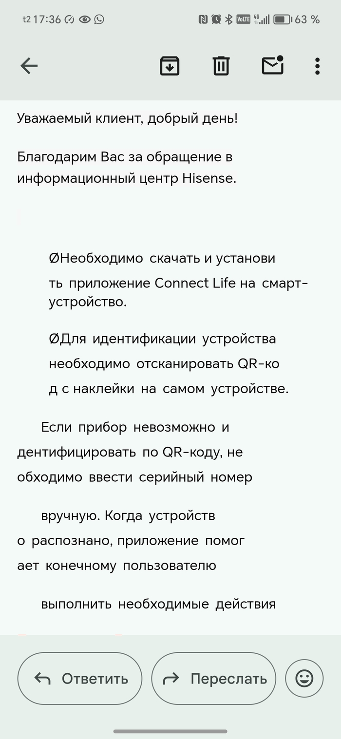 Приобрёл недавно посудомоечную машину компании Hisense. Модель HV693A66UVAD, произведена в феврале 2025 года. Покупал во многом из-за возможности управлять через приложение, но тут возникла загвоздка. Приложение видит посудомойку через Wi-Fi, но упорно требует QR или AuID, которые не распознает и выдаёт ошибку. При звонках на горячую линию отправляют на свою почту. На письма в поддержке отвечают какие-то гении, которые предлагают вбить серийник (нет реализовано ручной ввод серийного номера, только AuID) и скачать старый ConnectLife, который уже не работает на территории РФ.