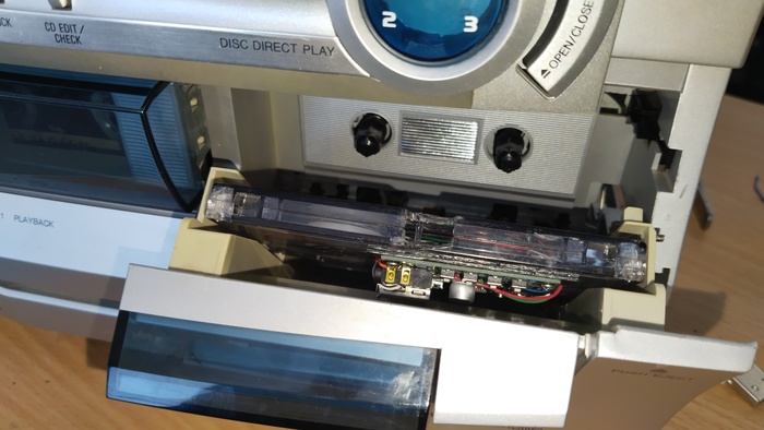 Очередной проект внедрения цифрового плеера в старый музыкальный центр Aiwa. Особенность этой работы в том, что на родные кнопки были установлены (приклеены) плоские малюсенькие кнопочки. Всего 5 штук. В режиме AUX эти кнопки никак не влияют на работу центра. (В других проектах кнопки управления - Play, Mode, переключение треков, приходилось обрезать от всей электроники центра). Таким образом центр полностью сохранил свой функционал. Компакт диски, кассета, радио всё работает. И вот теперь MP3 и блютуз добавился. Сначала сделал всё на одном плоском шлейфе, но пошёл фон по звуку. Пришлось переделывать звук на экранированный кабель. Таким образом сохранился внешний вид музыкального центра. Получается, что когда нажимаешь на кнопку Play в режиме mp3, то достаточно нажимать слегка. А когда в режиме диска или кассеты, то чуть сильнее - можно даже пальцем ощутить едва заметный двойной клик кнопки.