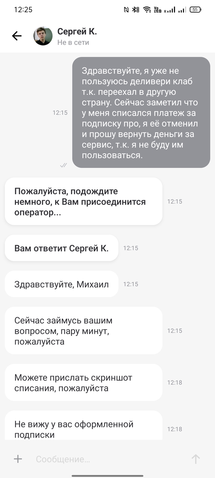 Как то подключил деливери про для удобства, забыл конечно, уже давно не пользуюсь и замечаю списание сегодня. Пишу в техподдержку, как это делал во многих сервисах с подпиской, мол так и так - "сервисом вашим не воспользовался и пользоваться не планирую", без проблем отменяли транзакции, даже те заявление по которым было не день в день.
