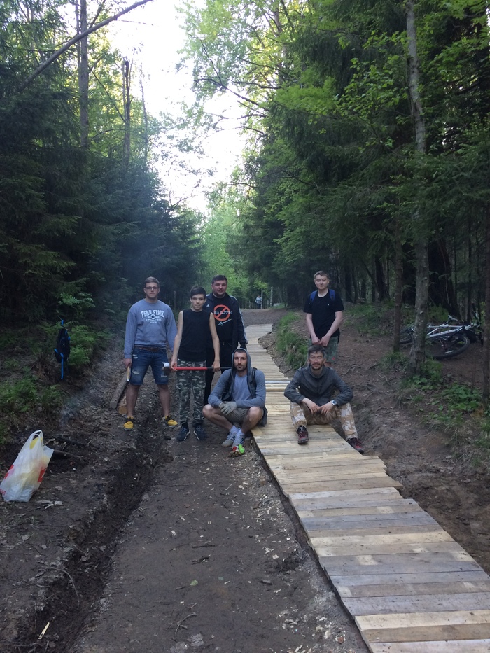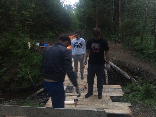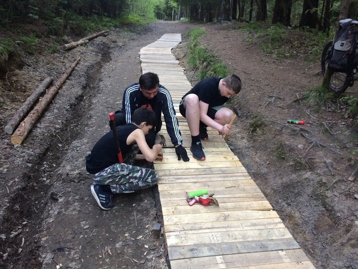 Досок и гвоздей на такую короткую тропинку ушло много. В этом абзаце хочу выразить благодарность завхозу местного предприятия, который отдал нам 20кг гвоздей и разрешил разбирать поддоны. Все же какое интересное совпадение, делаешь дело и все ладится и гладко идёт.