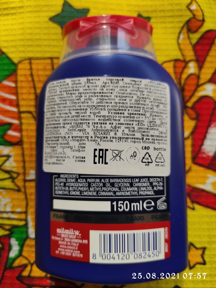 После бритья: лосьон - гель фирмы Figaro производства Италии. Прозрачный, слегка густой лосьон или жидкий гель ☺ ,запах приятный, держится пару часов, прижигает ну очень сильно, как в фильме " Один дома " ☺ впитывается за пару минут, слегка липнет, но быстро проходит. Мне понравился.