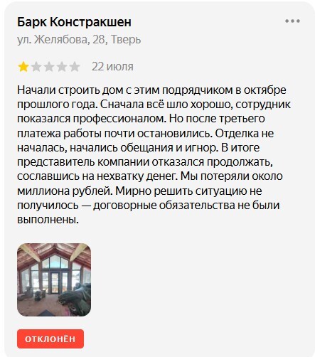 Через некоторое время в интернете начали появляться негативные отзывы — люди обвиняли Александра в мошенничестве, неисполнении обязательств, присвоении денег. Я спросил Александра об этом, на что получил ответ что это мол конкуренты порочат репутацию компании перед строительным сезоном. Однако позже я выяснил, что эти люди — реальные пострадавшие от действий этого застройщика, 3 семьи с общим ущербом около 10 миллионов рублей.