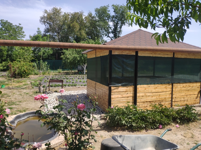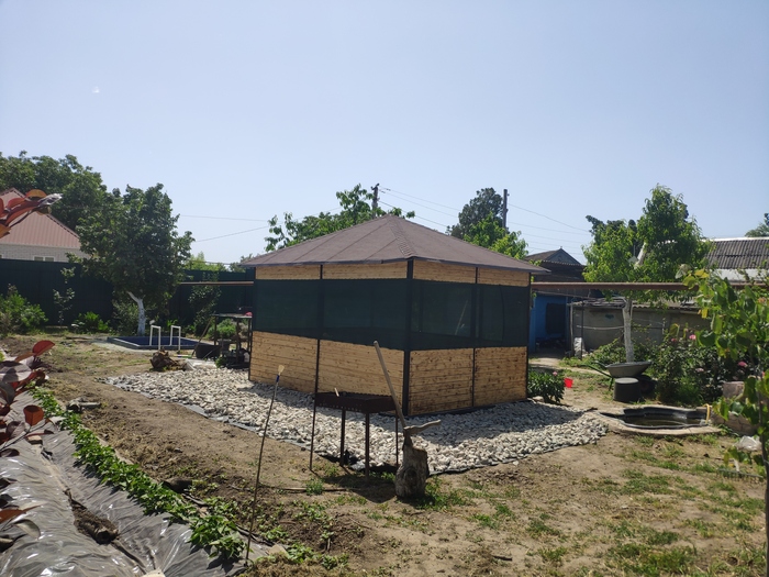 по минусам, в жару +40крыша сильно греется и жар спускается в низ. В итоге получается не тенёк, а духовка. Нужно делать теплоизоляцию