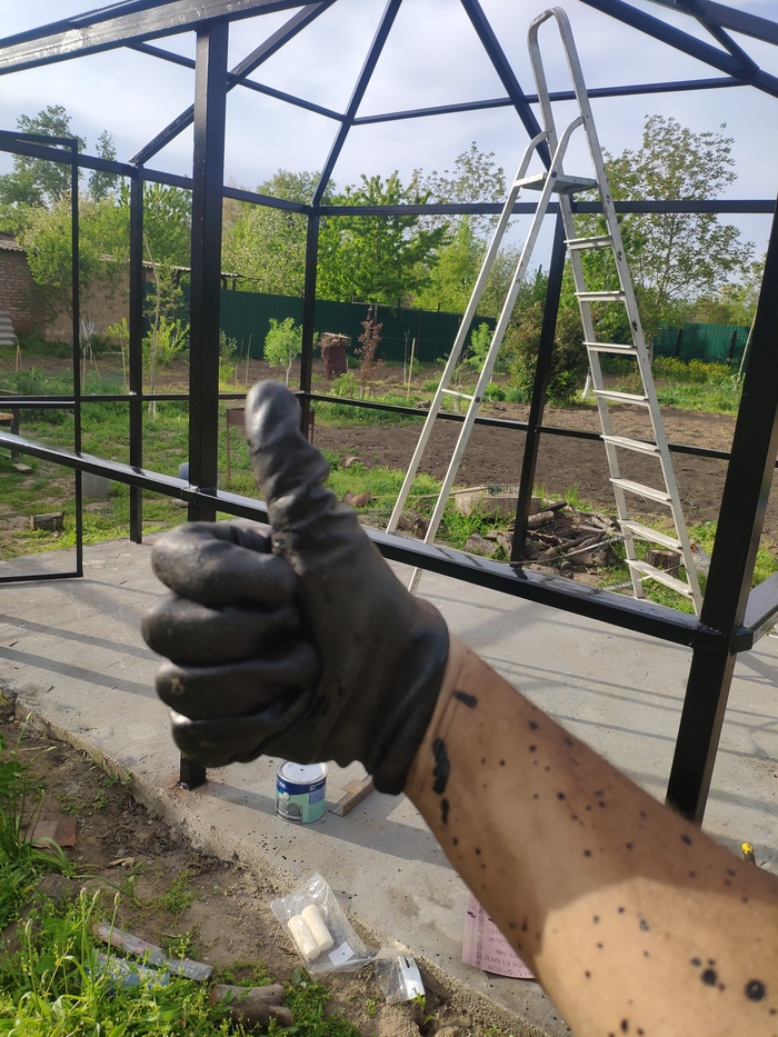 Проведя пару лет в такой вот беседке пришли к тому что пора делать что-то более капитальное. Подсобирав 60000 рубликов приступаем к работе. По инструменту в наличии эллектролобзик китайский за 1200, сварка 3000, шуруповёрт куплен на авито за 500, маленькая болгарка, уровень, штык, шуфель, ванна для раствора. руки 4 штуки, мои+жена.