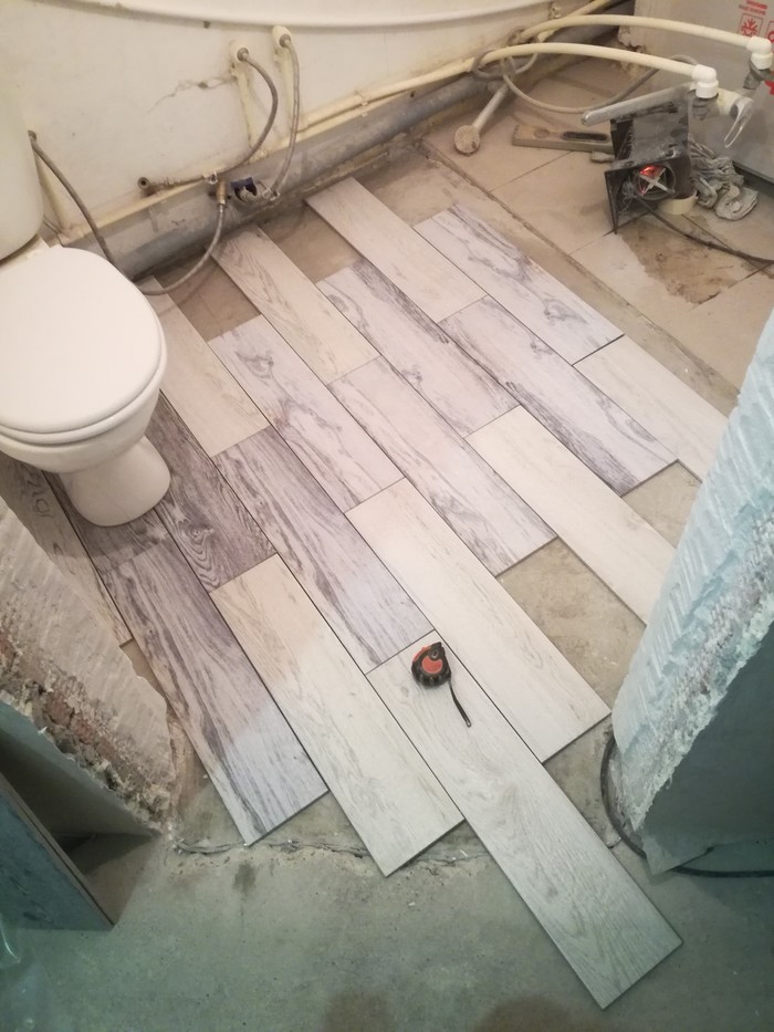 Ребята, подскажите электрику, откуда нужно начинать ложить плитку на пол в ванной с усечёным одним углом.? Плитку я примерно по своему желанию разложил. А вот стартовую плитку я не могу понять. Ткните в неё плиз. Систему выравнивания плиток я закупил. На клинья соберу. И возле порога на сколько выводить плитку лучше? В коридоре ламинат будет. Порожек со скрытым креплением хочу. А не сквозной.