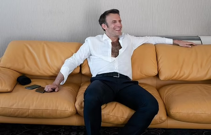 Его фотограф выложил несколько снимков президента Франции, на которых он вальяжно сидит на кожаном диване в расстегнутой рубашке, закатанным рукавом и с улыбкой до ушей.