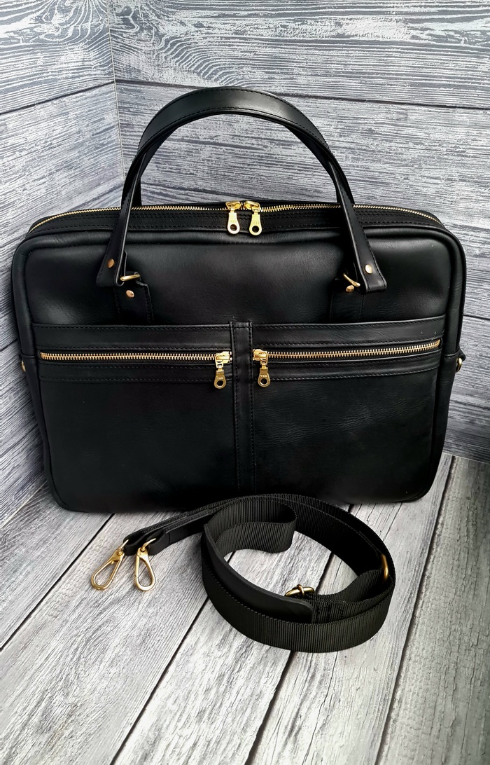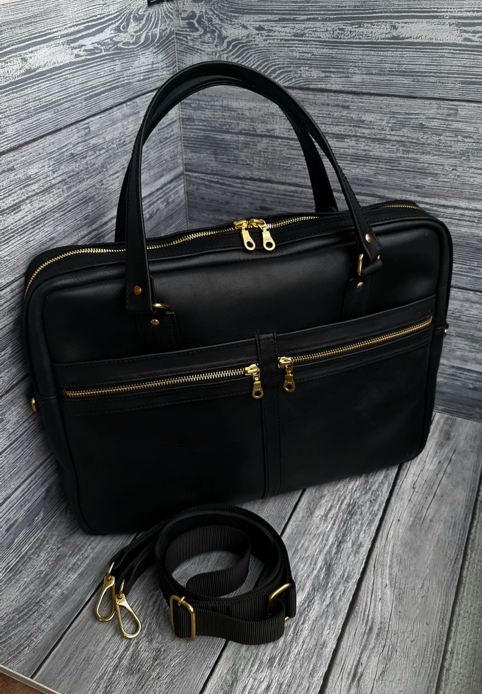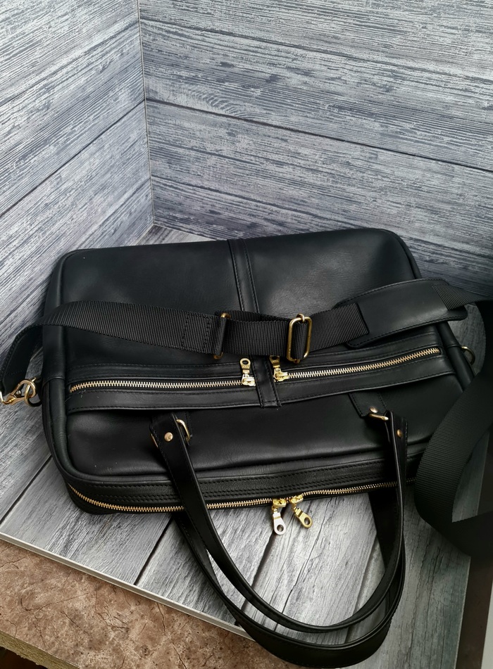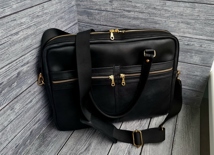 Деловая сумка/портфель/брифкейс для ноутбука и документов. Ну, было свободное время иногда, шил не спеша, и вот, наконец, закончил её. Натуральная кожа - юфть толщиной 2 мм. Латунная фурнитура, молнии YKK с полированными зубьями. Подкладка - непромокаемая чёрная ткань оксфорд.