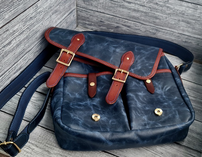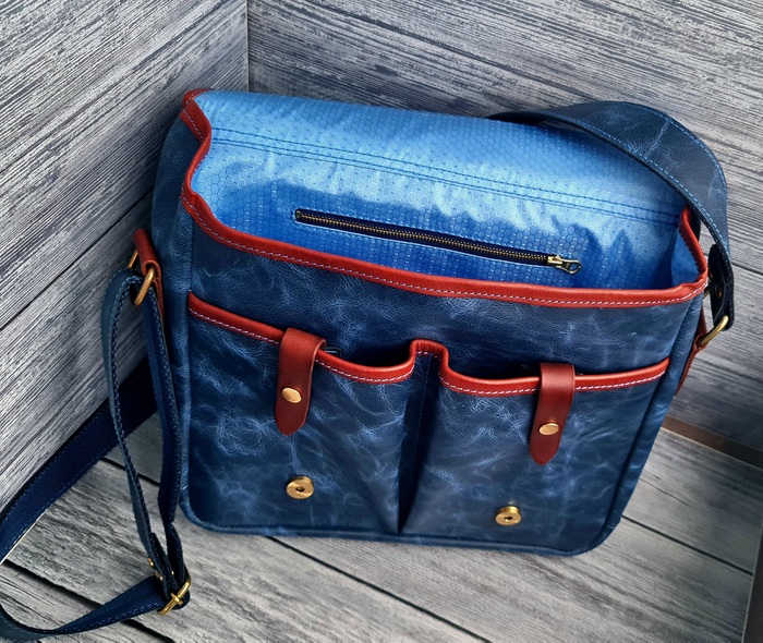 Снаружи два накладных кармана, два на молнии. Внутри один на молнии и один накладной карман. Ремень для переноски из плотной стропы полиэстер шириной 38мм, регулируемый по длине, с наплечником на латунных карабинах