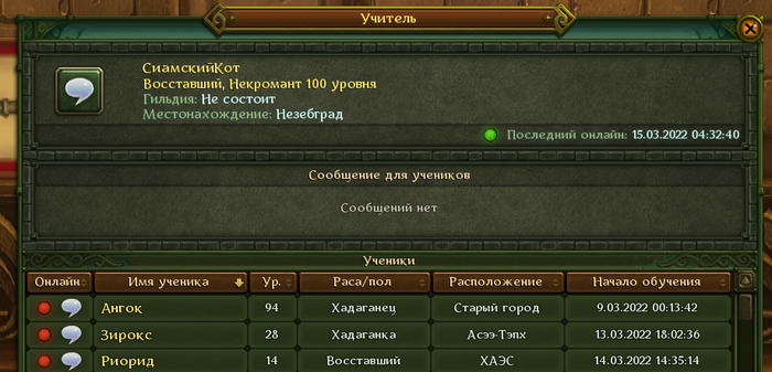 Мой молчит как партизан, а вот у друга, учитель написал ему первым, затер про пвп спек на местного мага ( тут это фаер, лол) и отсыпал от щедрот 4к голды.