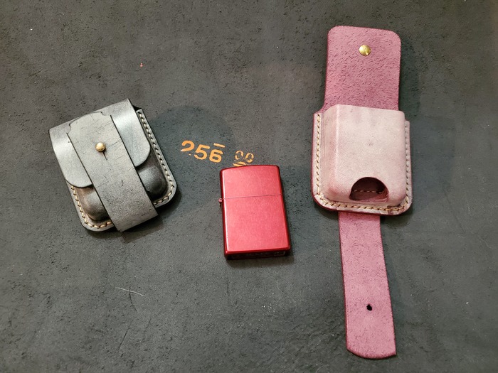 Карман задуман как альтернатива оригинальном чехлу "половинке" на кнопке после потери зажигалки из него. Таскаю такой уже не первый год. Пока попыток побега моей Зиппки из такой конструкции замечено не было. В этом изделии использовал кожу White wax толщиной 2,2-2,5 мм. Отформована, склеена и прошита, торцы заполированы. Короче всё как у всех.