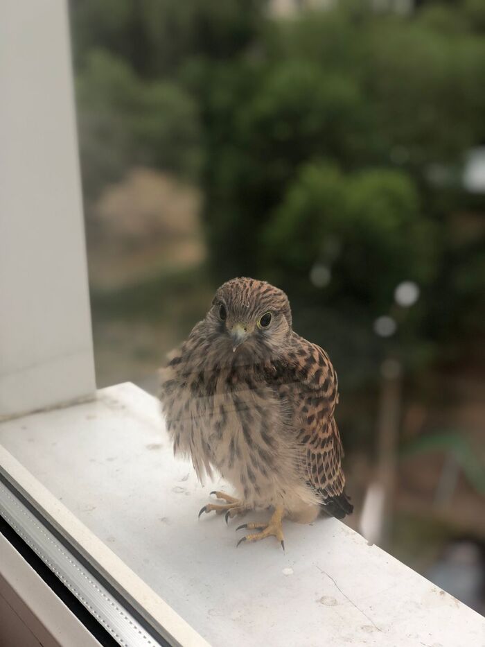 Черт его знает насколько это нормальное поведение для такой птицы, кинул ему мяса кусок на всякий случай. Визуально вроде без травм, к нам относится споуойно даде если вплотную за окном стоим. Если не улетит что с ним делать не совсем понятно.