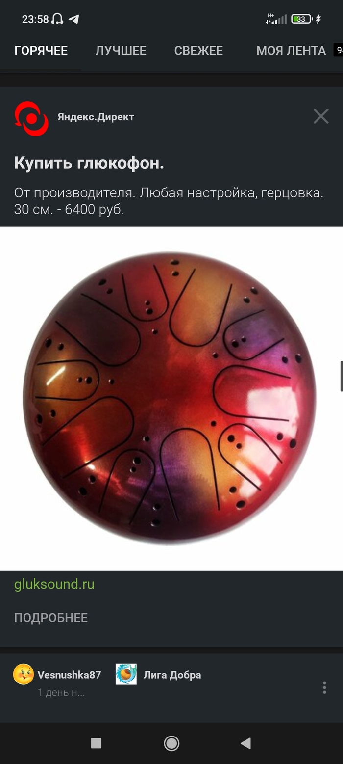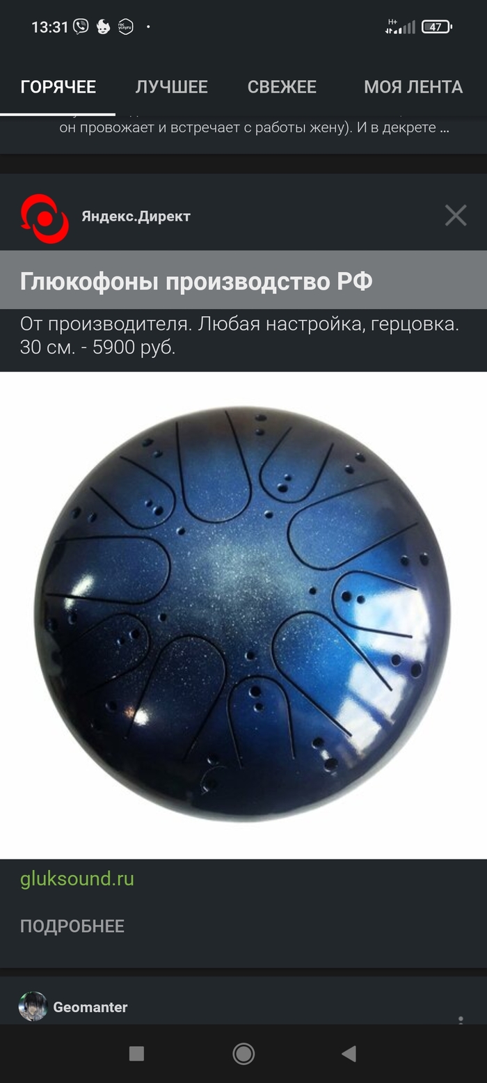 Несколько раз видел посты, о том что на Пикабу появляется реклама, того чем ты интересовался в интернете, или говорил вслух около телефона. Я не интересовался данным устройством, или инструментом. Но не первый раз мне попадается данная реклама. Может у меня есть скрытый талант о котором я не подозреваю и Яндекс на основе моих интересов требует чтобы я попробовал глюкофон) .