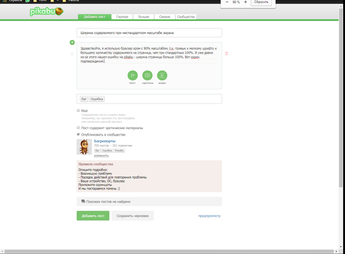 Здравствуйте, я использую браузер хром с 90% масштабом, т.к. привык к мелкому шрифту и большему количеству содержимого на странице, чем при стандартных 100%. И уже давно из-за этого нашел ошибку на pikabu - ширина страницы будет больше 100%. Вот скрин подтверждения.