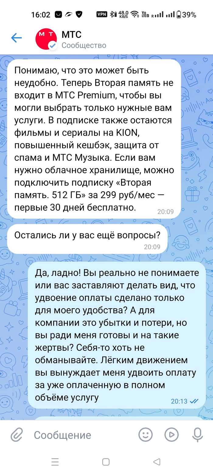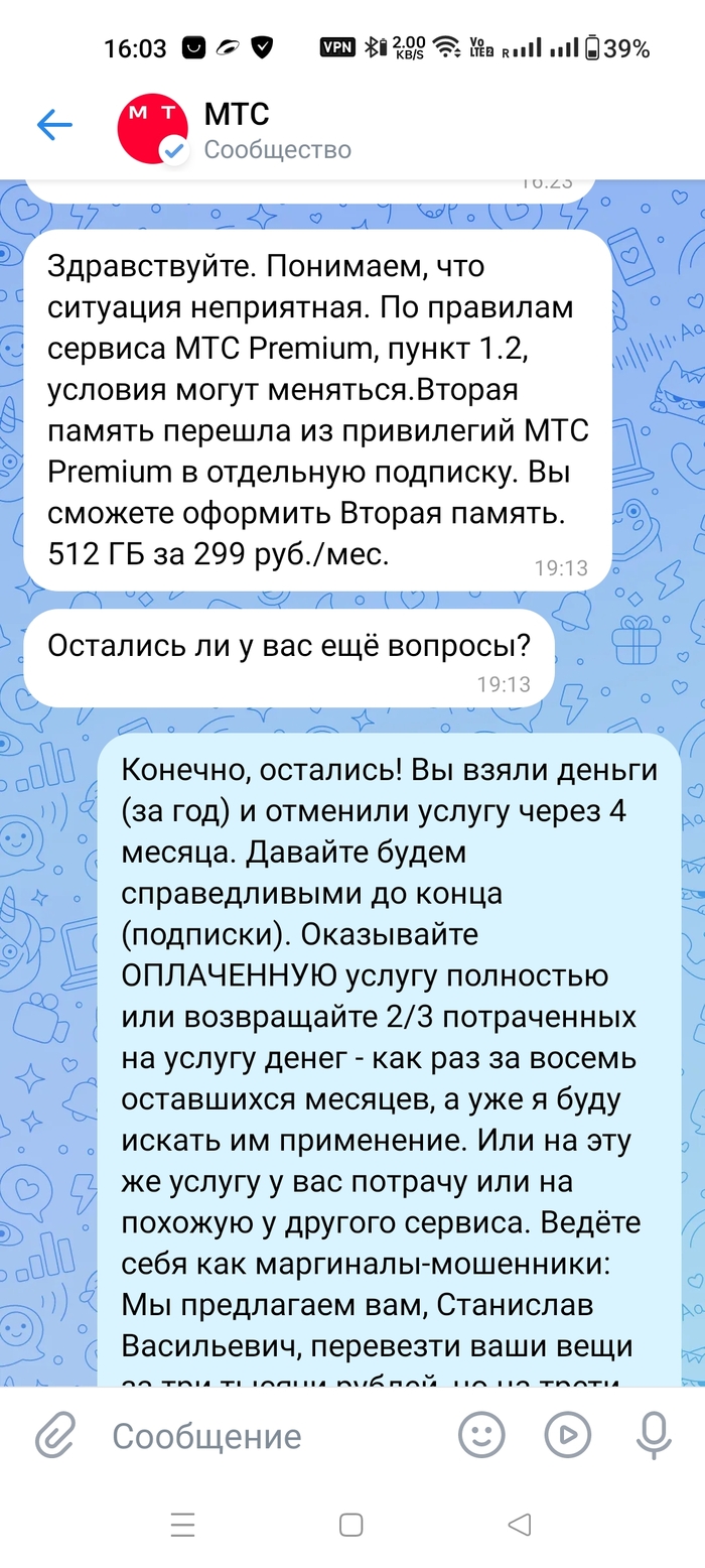 В ноябре 2024 я подписался на их Премиум, так как привлекла услуга Вторая память размером в 512 гигов на всё время действия подписки. Искал, куда продублировать контент с гугл-фото. Закачал. Довольный пользовался аж четыре месяца, но жаба МТСа праздник обладания Премиумом разрушила одной смс-кой: