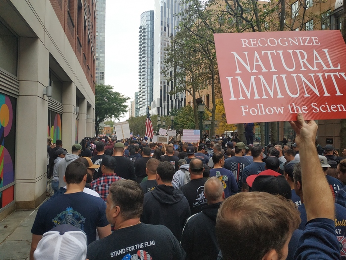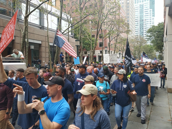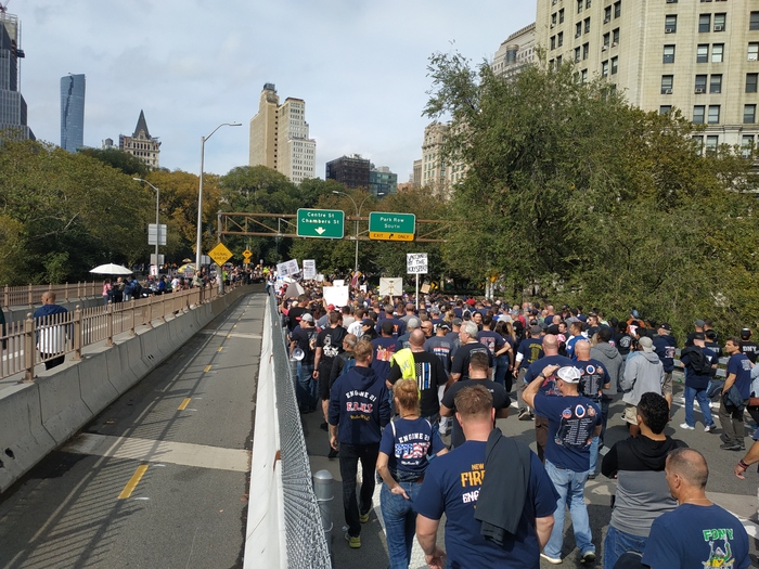 Пожарные, полицейские, мусорщики и работники скорой вышли с семьями и прошли из Бруклина в Манхэттен, протестуя против ОБЯЗАТЕЛЬНОЙ вакцинации, половина (а может и больше) была привита, протест был именно против насилия. Я насчитал тысяч тридцать ( исходил из ширины моста, его длины и плотности шедших).