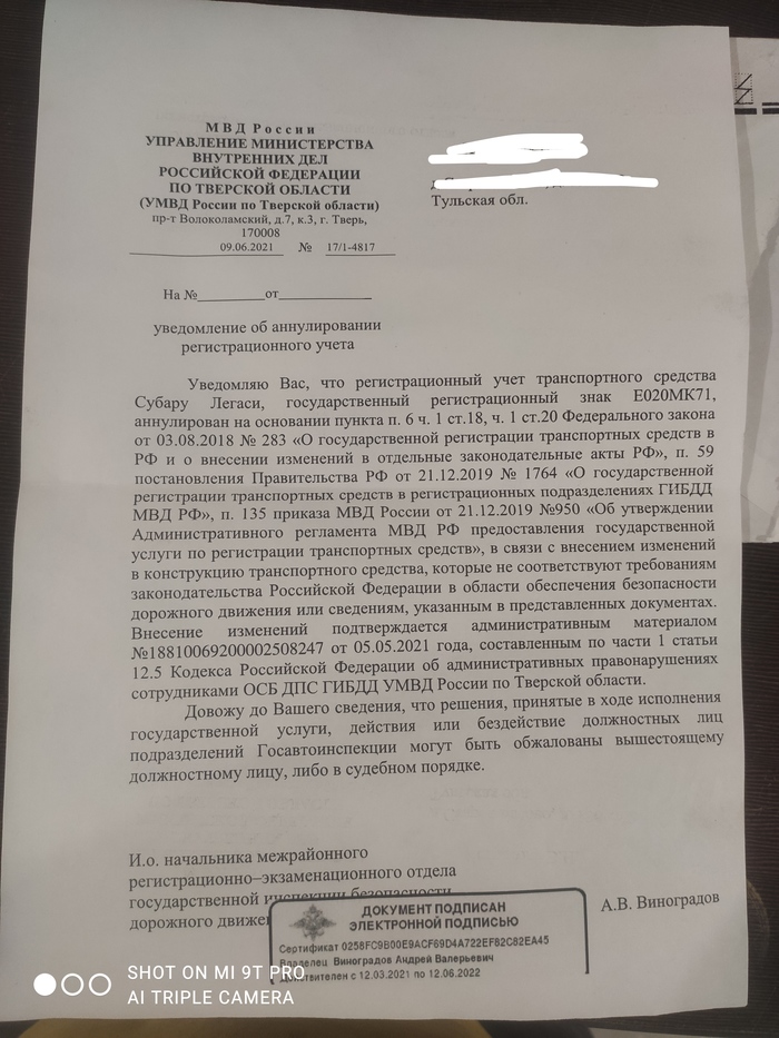 Случилась такая ситуация: 5 мая 2021 года возвращаясь с отпуска из питера в тулу, был остановлен ГАИшниками в твери, на выезде с газовой заправки. Оборудование на машине не зарегистрировано, и сделать это не представляется возможным в связи с запретом на регистрационные действия. ГАИшниками был составлен протокол, произведена фотосъемка, выписано предписание на устранение нарушения. Я поинтересовался, смогу ли я в наше тульское ГАИ показать машину без ГБО и получил утвердительный ответ. Через два дня, после выходных МРЭО, я приезжаю показать машину без газового оборудования. Объяснив инспектору причину моего появления и место где выписано предписание, он растерялся и позвонил кому-то посоветоваться, что со мной делать. Осмотрев машину, сфотографировав отсутствие ГБО сказал что я могу ехать. Перед отъездом я ему говорю, что я бы и рад зарегистрировать переделки в авто, дабы не попадать в такую ситуацию, но у меня запрет на регистрацию от приставов. Он мне сказал, что раз есть запрет, значит тверские ГАИшники, да и ни какие в общем-то не могут приостановить регистрацию, и что мне стоит в случае чего только оплачивать штрафы. На этом мы и попрощались.