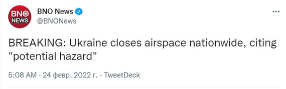 Украина закрывает воздушное пространство над своей территорией, ссылаясь на «потенциальную опасность» BNO News