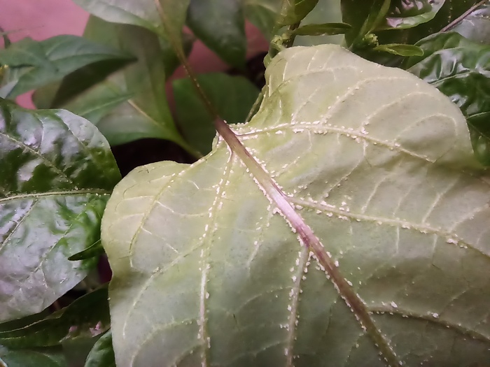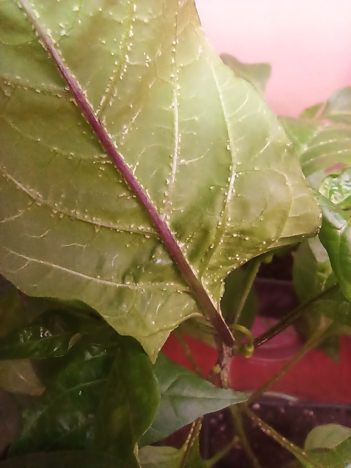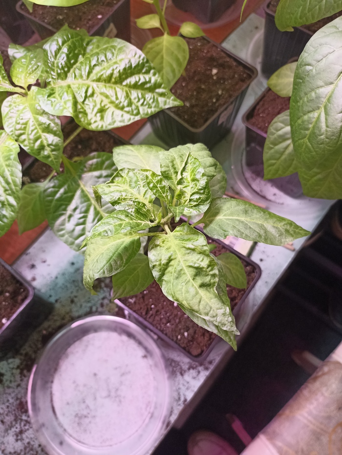 Добрый день! Нужен совет по рассаде острых перчиков. На листьях растений появился такой вот налёт, сначала на внешней стороне листа