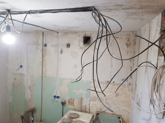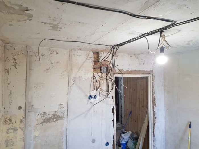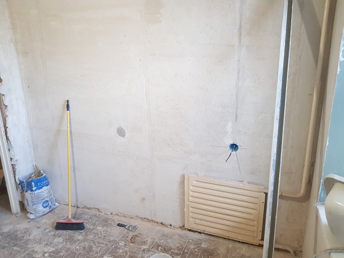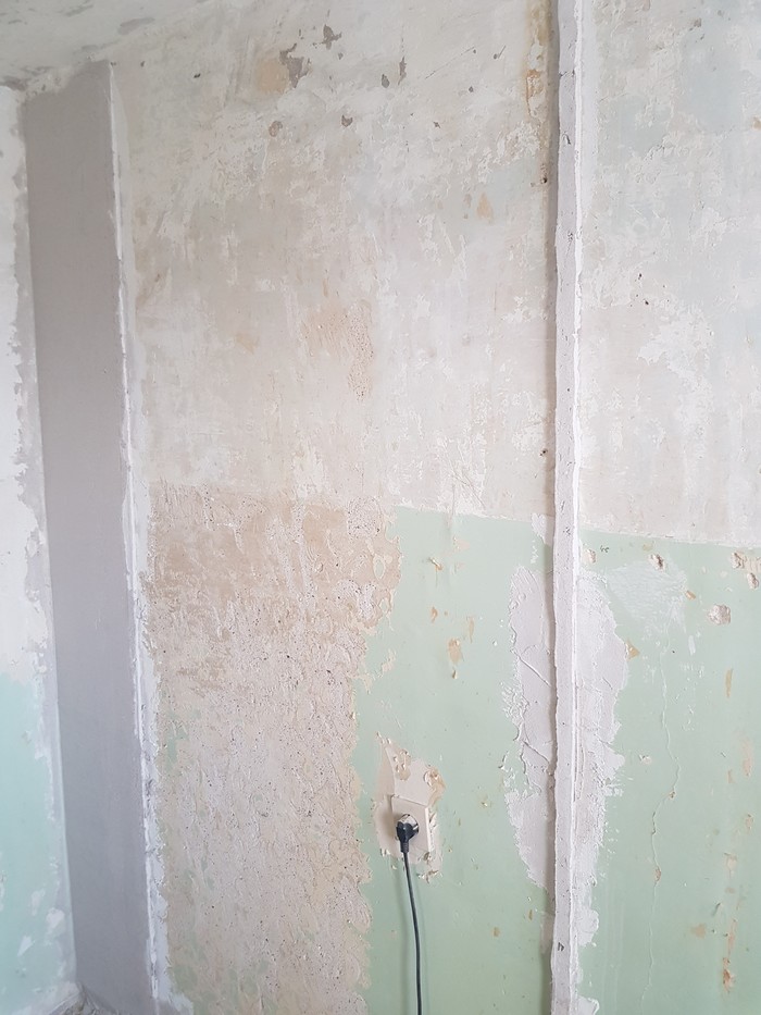 Оштукатуривание стен. Сложнее всего было отбивать старую засохшую краску... Чем только я не пытался ее сбить, и спец насадки на УШМ покупал, и перфоратором с широкой лопаткой пробовал. Легче всего уходила только с помощью самодельной насадки на дрель из двух кусков цепи.