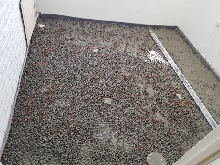 По всей квартире полы будут в один уровень. За ноль взял пол на кухне. Отнял толщину чистового покрытия, и получил высоту чернового слоя. С помощью лазерного нивелира перенёс и сделал отметки на стене в комнате. В итоге средний слой получился по комнате 9,5 см. По моим подсчётам, мне понадобится 25 мешков керамзита(40 литров) ушло 24. 40 мешков песка(30 кг), 10 мешков цемента м500(25 кг), пришлось докупить еще 2 мешка, а так же 5 мешков плиточного клея, самого дешёвого (25 кг). Фибра, маяки, пластификатор.
