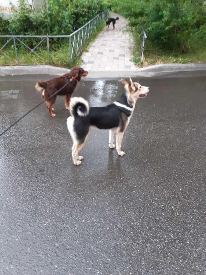 На улице поводок не тянет, спокойно реагирует на резкие звуки, не лает на людей и других собак.