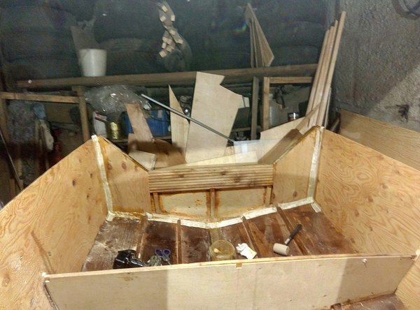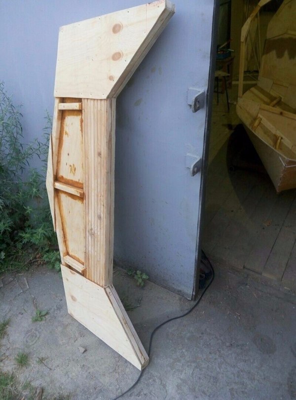 Отдельная история — это транец и форштевень. Транцем в нашем случае называют (хотя это не совсем правильно) корму, на которую будет потом крепиться подвесной мотор. Чтобы мотор не оторвал его от остального корпуса и не разломал, он должен быть очень прочным. Я сделал транец из нескольких слоёв фанеры, проложил сетку из бруса и лиственничную доску поперёк, и сделал ещё накладки (кницы) на всё это безобразие: