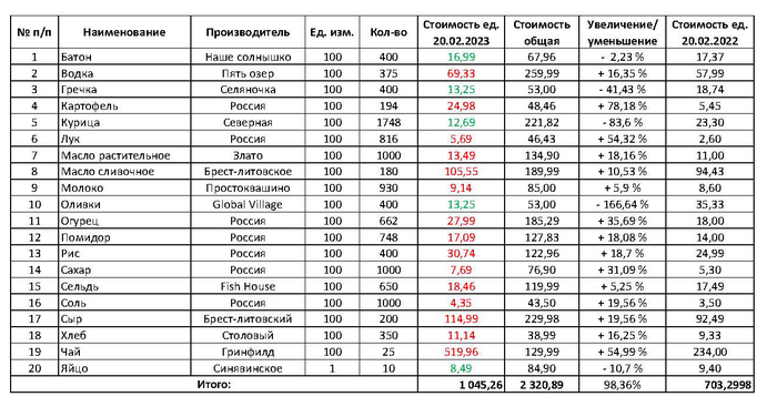 Красным выделено подорожание, зелёным соответственно то, что подешевело. Водка вообще никуда не сдвинулась... Стабильность. Но я немного не понимаю почему цены во многом выросли, а стоимость за единицу уменьшилась. Может кто подскажет где ошибка?