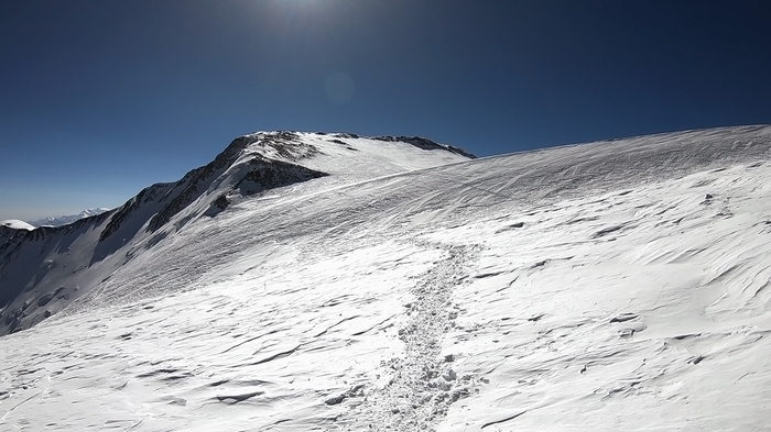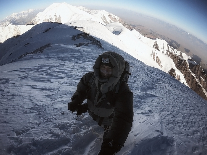 Медленно но верно мы ползли вперед сопротивляясь холоду и ветру. Когда спустились в седловину на 6000, я остановился немного передохнуть и почувствовал, как Макс тычет в меня сзади, привлекая внимание, потому что орать при таком ветре попросту бесполезно. Оборачиваюсь, «достаю» ухо из капюшона – «Что?» - я не помню, что именно он тогда мне сказал, но суть была примерно такая – «Я замерзаю. Возвращаюсь. Дальше ты один. Извини». Я уважаю решение своего друга, даже мне в тот момент стало невыносимо обидно, а ему и подавно, но он принял решение, а это самое главное. Обнялись, пожали друг другу клешни в верхонках (рукой это назвать язык не поворачивается) и разошлись. Макс пошел обратно в лагерь, а я продолжил путь вверх.