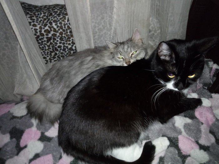 Живут у меня две шерстяные грелки. Тот, что сверху, черномазенький, с двухнедельного возраста воспитывался тем, что снизу, буквально грудью его вскормил. Мелкий наминал ему пузо в поисках сиськи, а тот кайфовал.