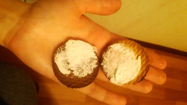 На деле оказалось, что само печенье практически безвкусное, а вот эта жижа посередине похожа на сметану с сахарной пудрой и ароматизаторами. Кушать можно, но до оригинала, как пешком до луны.