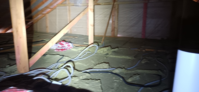 Внутри дома тоже всё было по красоте. Из-за отсутствия пароизоляции воздух сифонил отовсюду без всякой аэродвери.